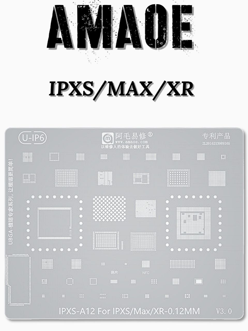 AMAOE IP XS/XS MAX/XR A12 STENCIL IS A HIGH-PRECISION BGA REBALLING STENCIL DESIGNED FOR A12 CHIP REPAIR IN IPHONE XS, XS MAX, AND XR MODELS.