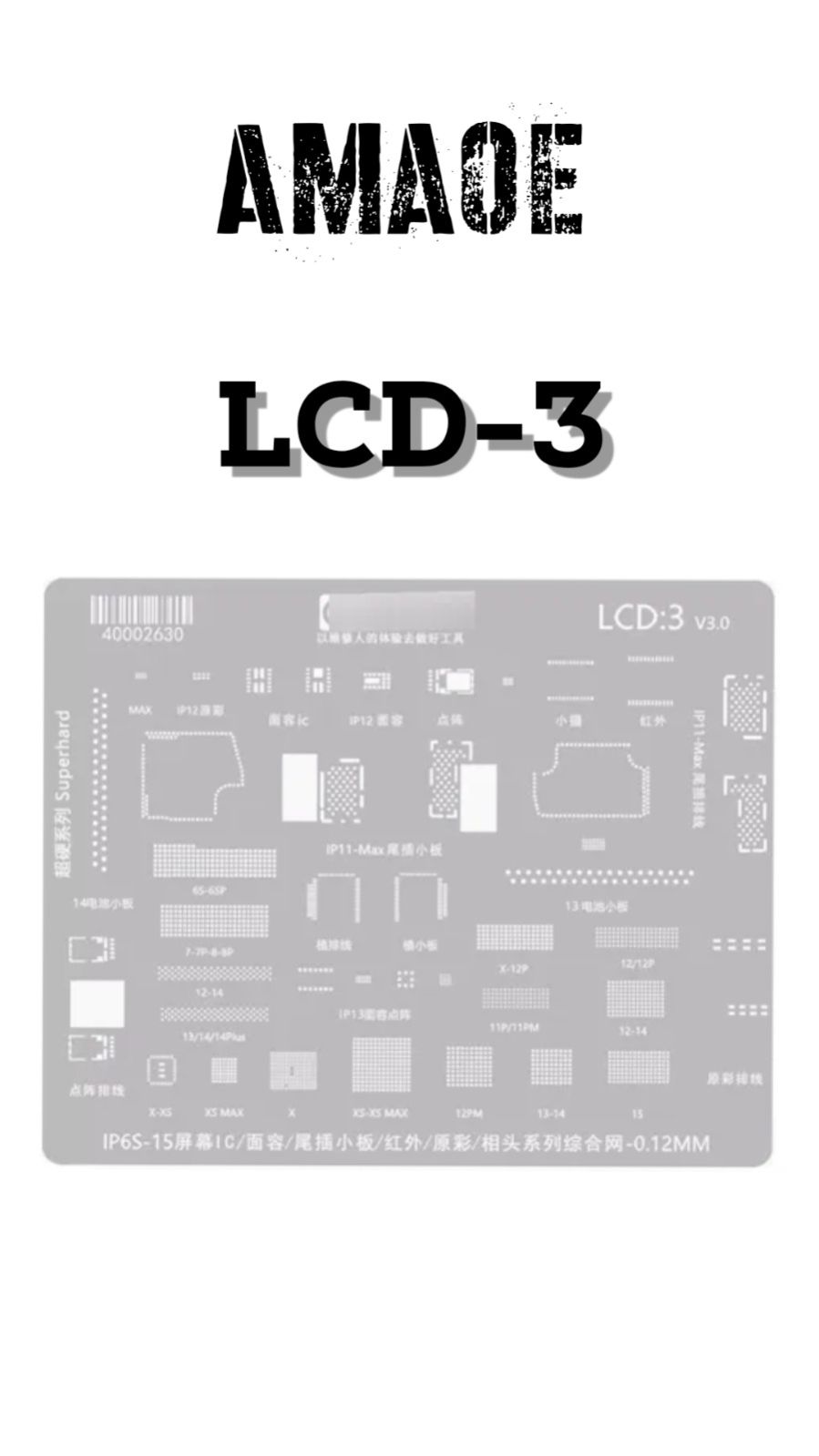 AMAOE LCD3 STENCIL IS USED FOR REBALLING AND REPAIR OF LCD ICs IN IPHONE 6S TO IPHONE 14 SERIES.