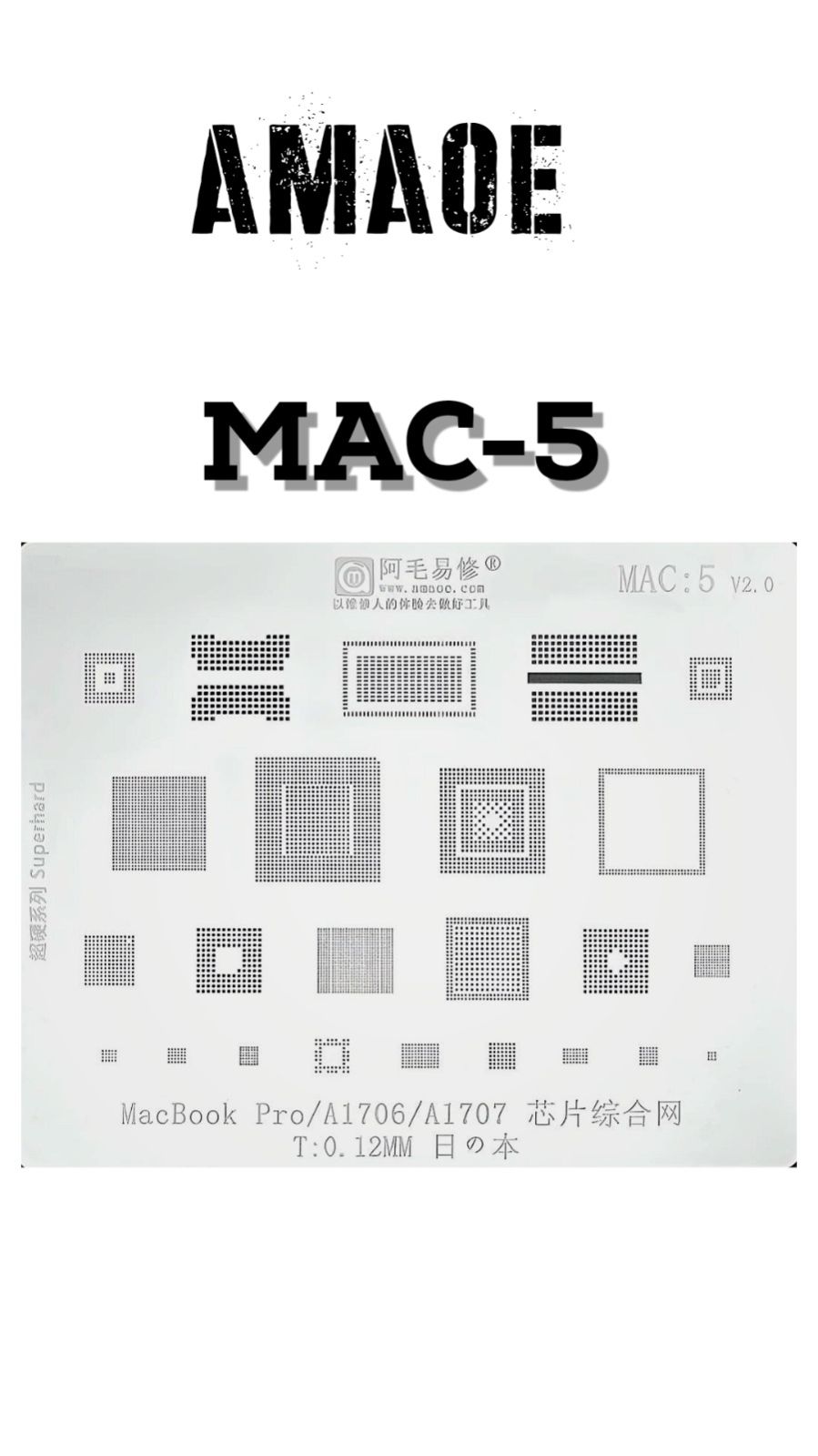 AMAOE MAC-5 STENCIL IS DESIGNED FOR PRECISE SOLDER PASTE APPLICATION ON PCB COMPONENTS, ENSURING ACCURATE PLACEMENT AND RELIABLE SOLDERING RESULTS.