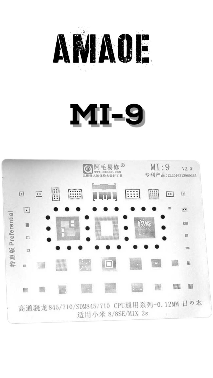 AMAOE MI-9 STENCIL IS USED FOR PRECISE SOLDER PASTE APPLICATION ON PCB COMPONENTS, PROVIDING ACCURATE ALIGNMENT AND STRONG SOLDERING PERFORMANCE DURING REPAIR OR ASSEMBLY.
