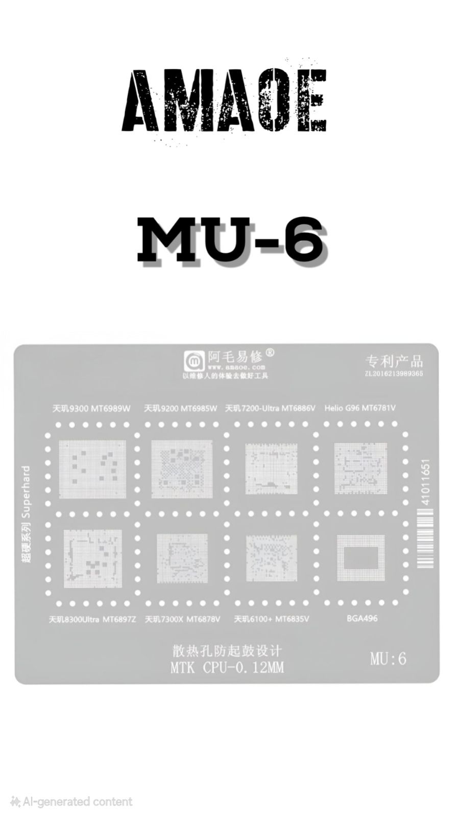 AMAOE MU6 STENCIL – HIGH-PRECISION 0.12 MM STEEL STENCIL FOR BGA REBALLING AND SOLDER PASTE APPLICATION ON MTK CPU AND RAM CHIPS, USED IN MOBILE MOTHERBOARD REPAIR.