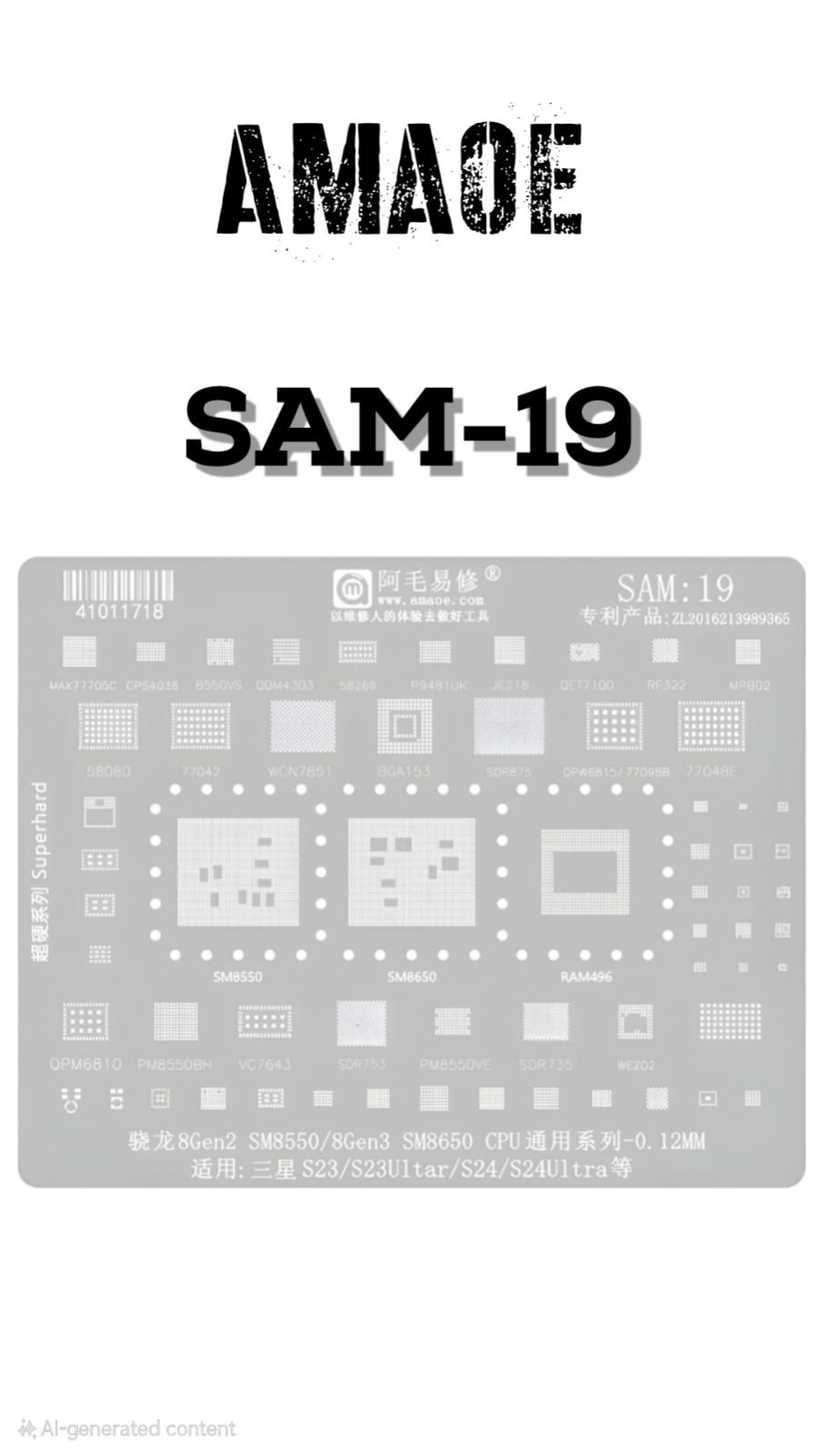 AMAOE SAM 19 STENCIL IS USED FOR PRECISE SOLDER PASTE APPLICATION ON PCB PADS, ENSURING ACCURATE SMD COMPONENT PLACEMENT.