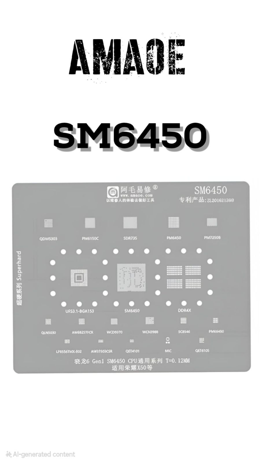 AMAOE SM6450 STENCIL IS A 0.12MM PRECISION BGA REBALLING TOOL FOR SNAPDRAGON 6 GEN 1 PROCESSORS, ENSURING ACCURATE SOLDER PASTE APPLICATION.