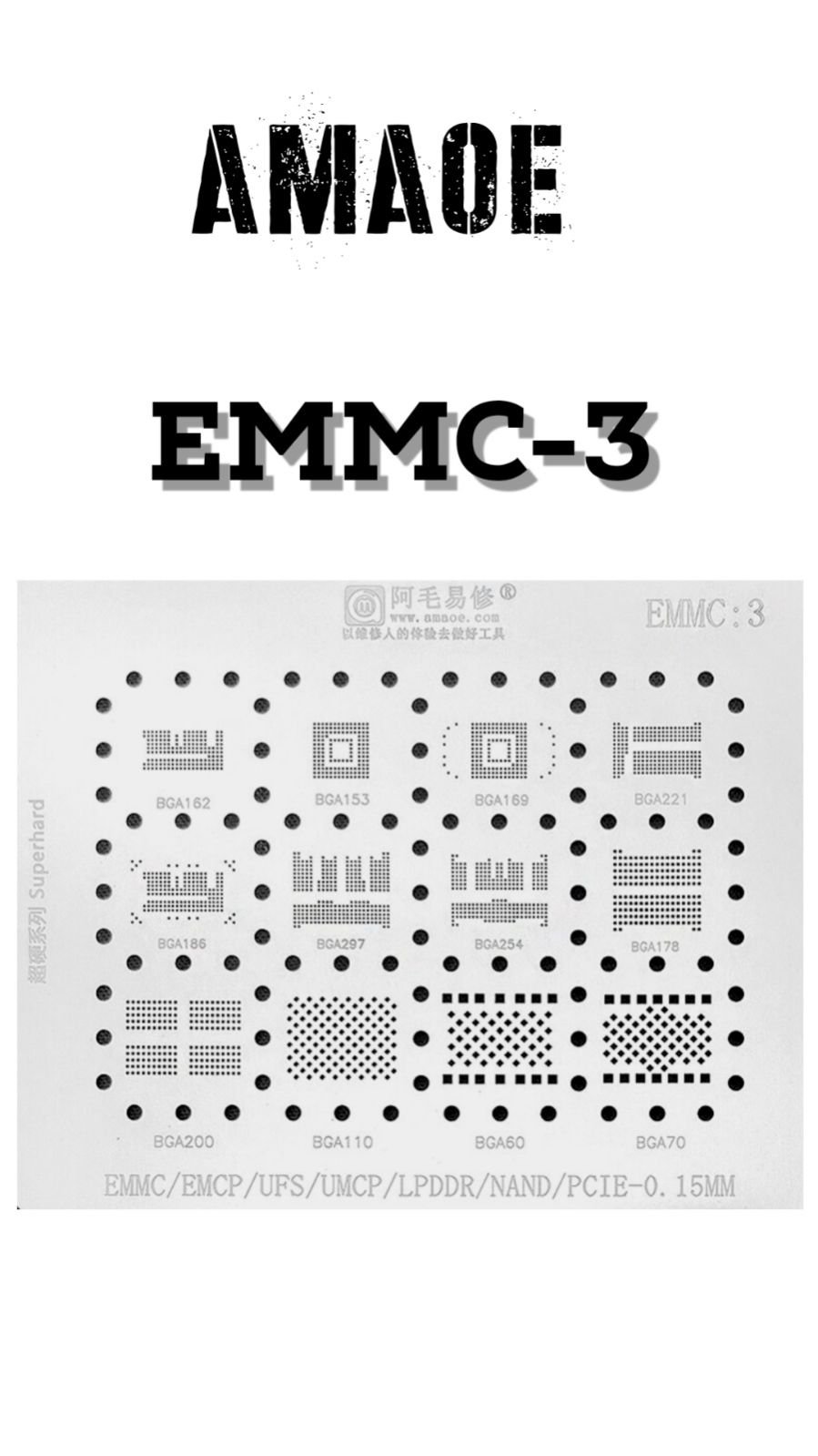 AMAOE EMMC3 STENCIL: HIGH-PRECISION PCB STENCIL FOR EMMC3 CHIP REWORK, ENSURES ACCURATE SOLDER PASTE APPLICATION, REDUCES BRIDGE & DEFECTS.