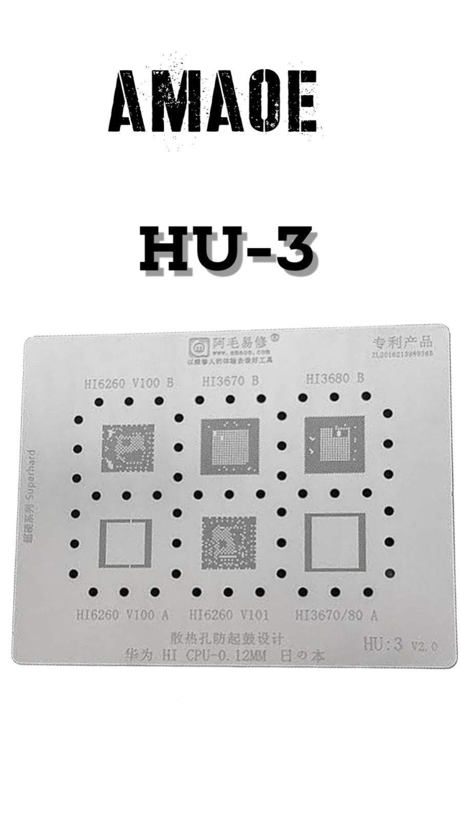 AMAOE HU3 STENCIL DESIGNED FOR HIGH-PRECISION SOLDER PASTE APPLICATION AND IC REBALLING IN MOBILE PHONE PCB REPAIR, ENSURING ACCURATE CHIP ALIGNMENT AND STRONG CONNECTIONS.