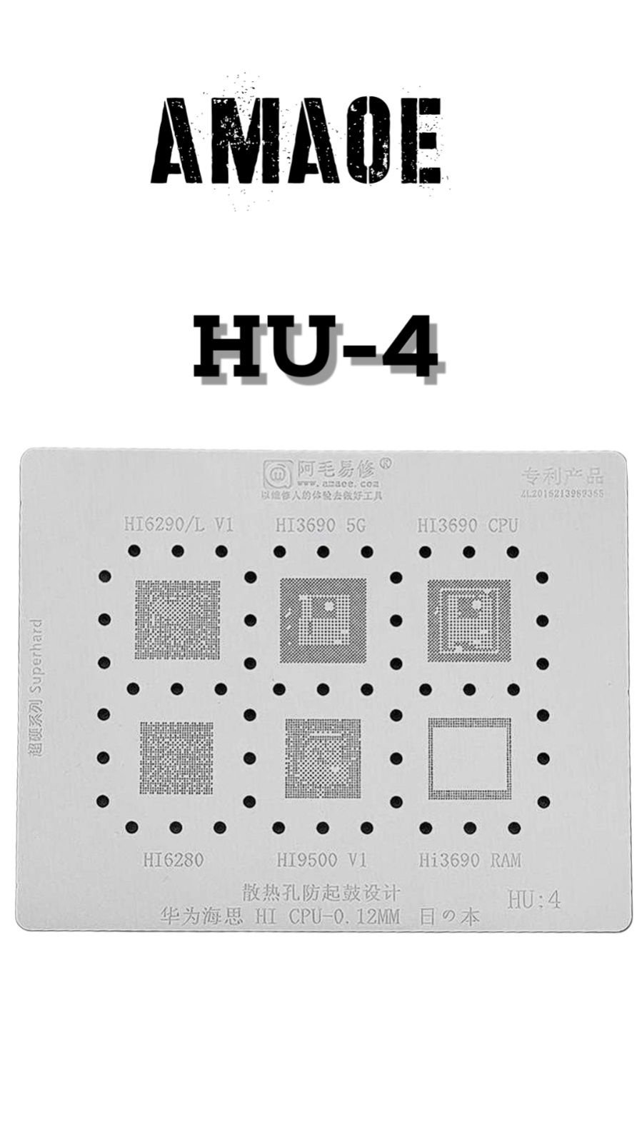AMAOE HU4 STENCIL DESIGNED FOR HIGH-PRECISION MOBILE CPU, EMMC, AND IC REBALLING, ENSURING UNIFORM SOLDER BALL ALIGNMENT AND RELIABLE PCB REPAIR PERFORMANCE.
