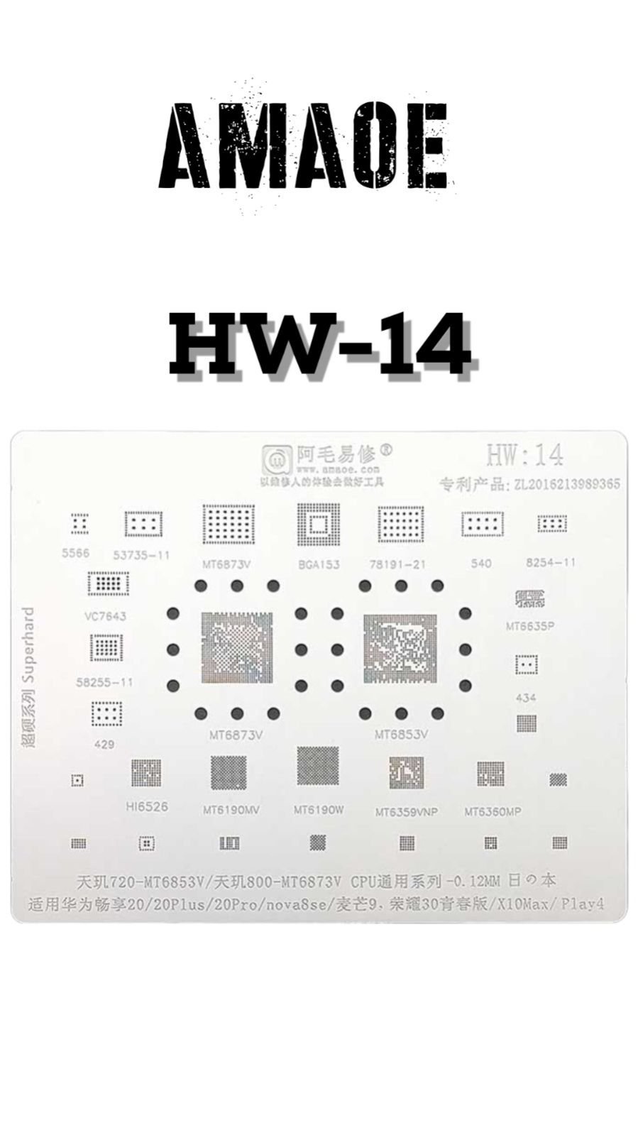 AMAOE HW14 STENCIL DESIGNED FOR PRECISE AND CLEAN SOLDER PASTE APPLICATION DURING MOBILE CPU, GPU, AND IC REBALLING, ENSURING PERFECT ALIGNMENT AND STRONG CONNECTIONS.