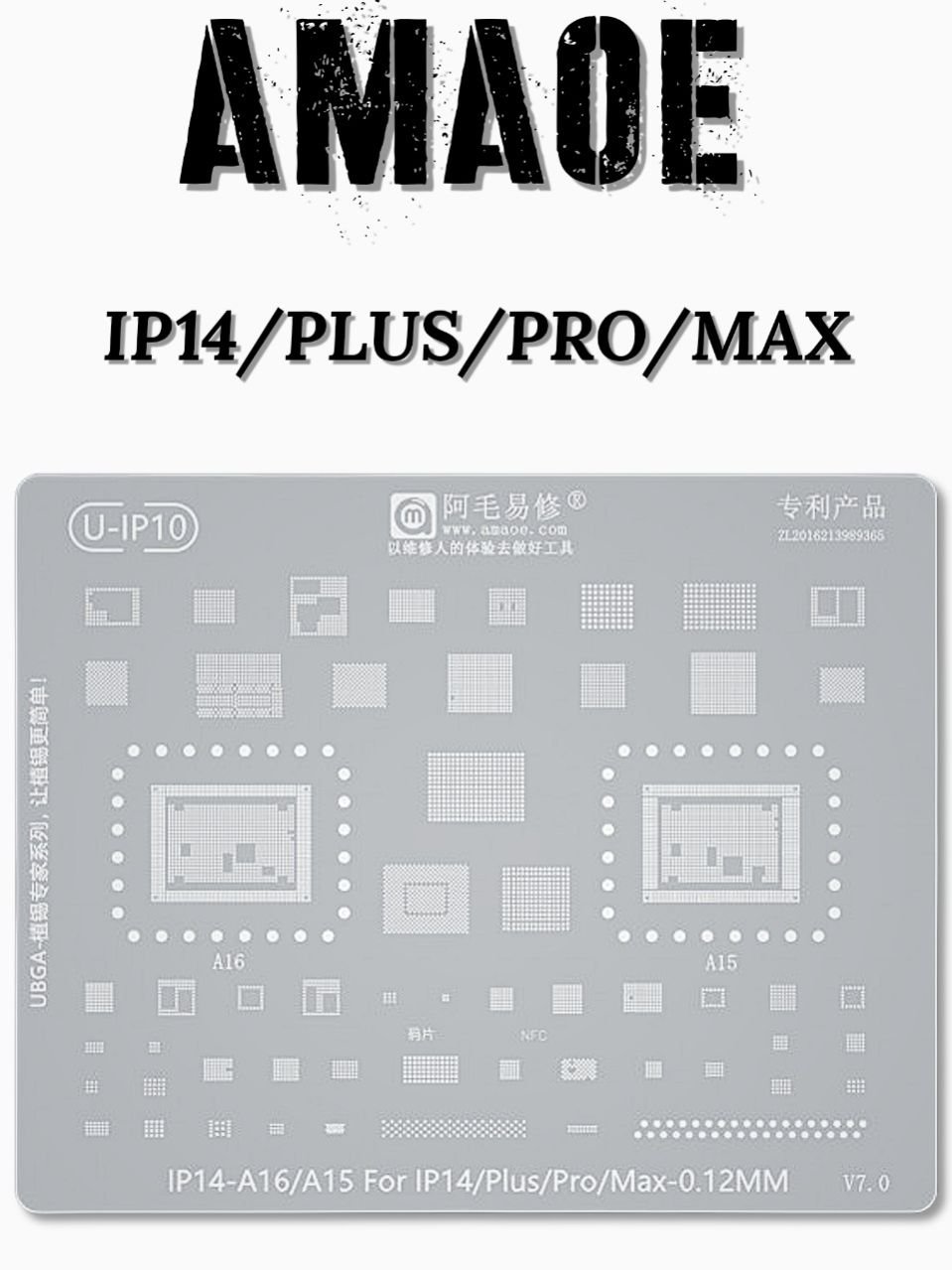 THE AMAOE U-IP10 IP14-A16/A15 STENCIL IS A PROFESSIONAL-GRADE BGA REBALLING TOOL DESIGNED FOR PRECISE SOLDER BALL ALIGNMENT AND REPAIR OF IPHONE 14 SERIES MAINBOARDS, INCLUDING IPHONE 14, 14 PLUS, 14 PRO, AND 14 PRO MAX.