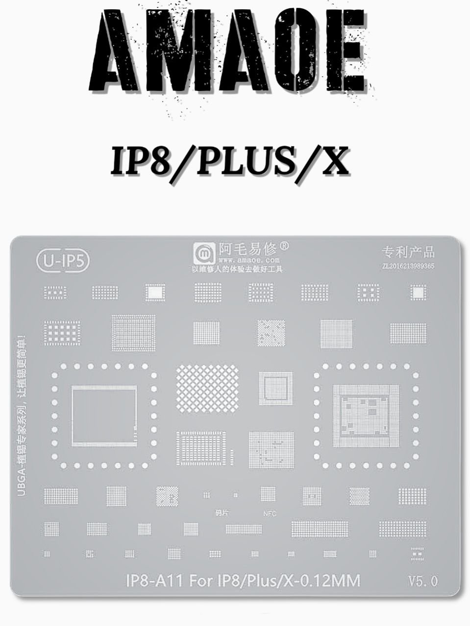 HIGH-PRECISION STEEL BGA REBALLING STENCIL FOR IPHONE 8 / 8 PLUS / X (A11), DESIGNED FOR ACCURATE SOLDER PASTE APPLICATION AND CHIP-LEVEL MOTHERBOARD REPAIR.