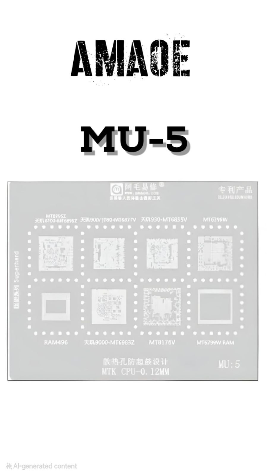 AMAOE MU5 STENCIL – HIGH-PRECISION 0.12MM STEEL STENCIL FOR MTK CPU & RAM BGA REBALLING, SOLDER PASTE APPLICATION, AND MOBILE MOTHERBOARD REPAIR.