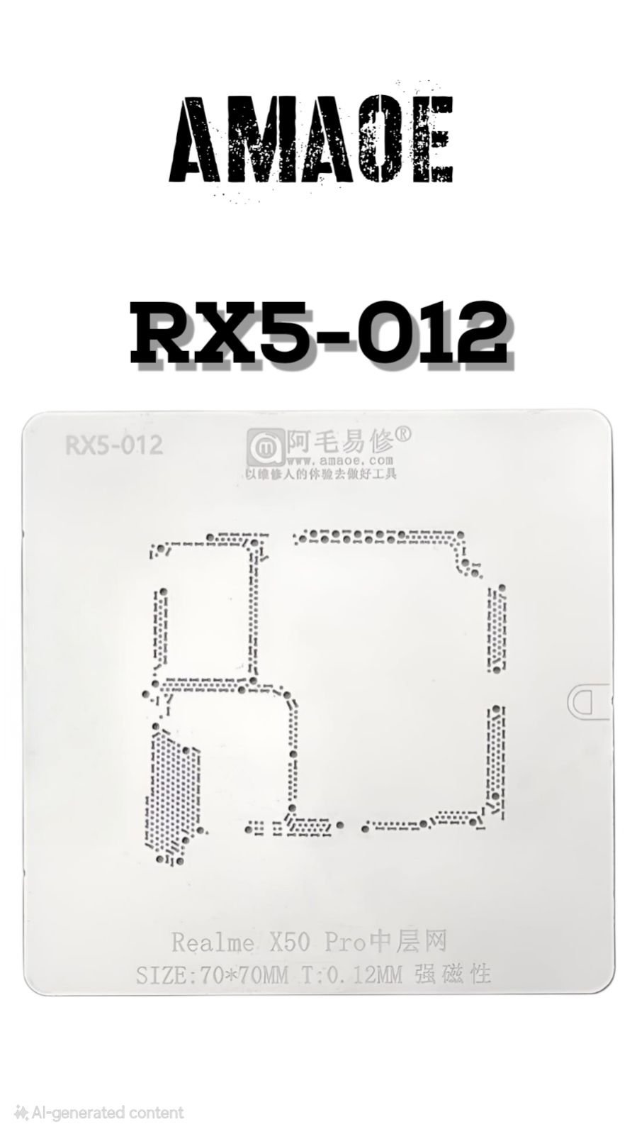 THE AMAOE RX5-012 REALME X50 PRO STENCIL IS A SPECIALIZED TOOL USED FOR BGA REBALLING DURING THE REPAIR OF THE REALME X50 PRO MOTHERBOARD.