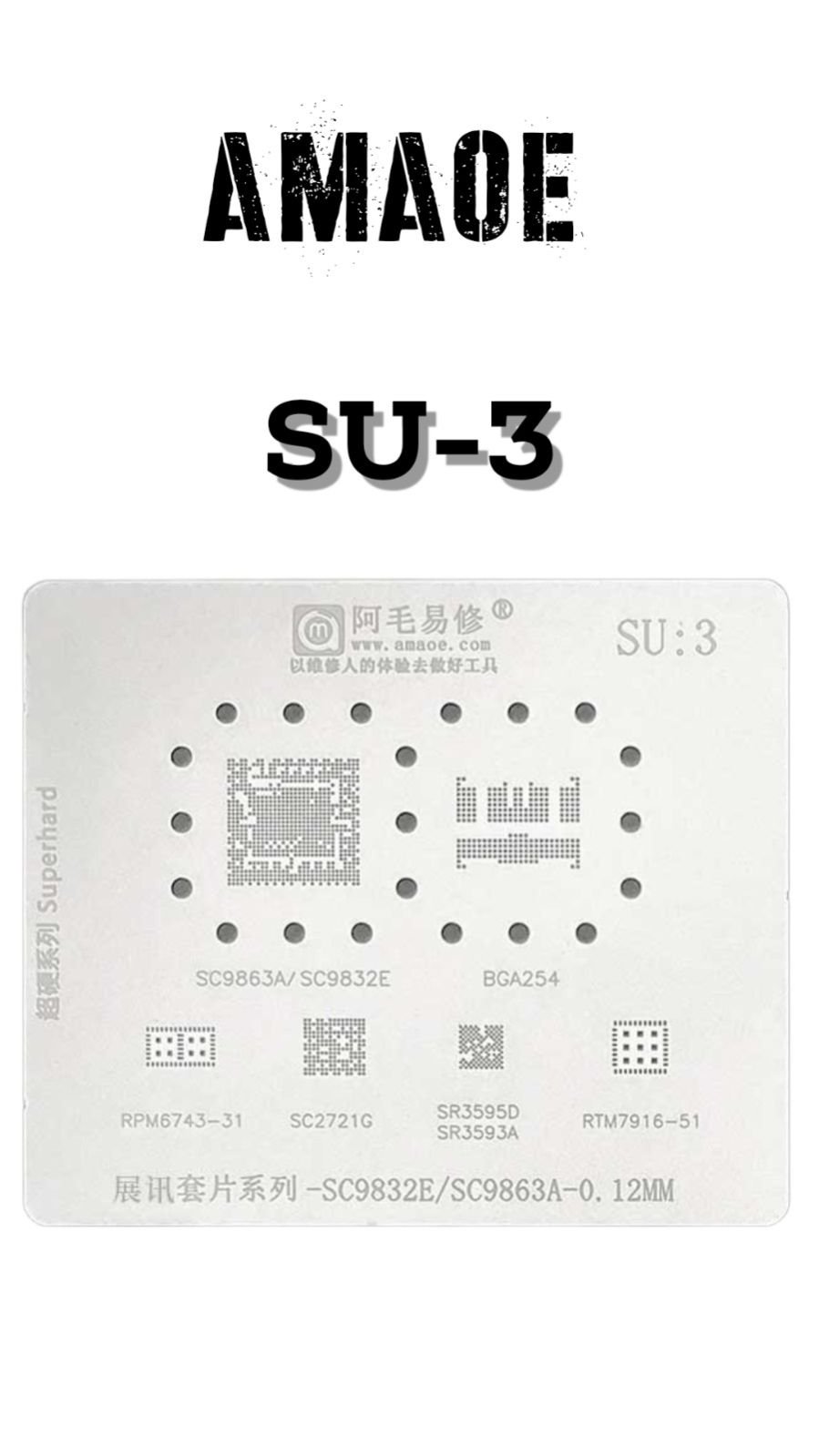 HIGH-PRECISION STAINLESS-STEEL STENCIL DESIGNED FOR SU3 PCB REPAIR AND SOLDERING. PROVIDES ACCURATE SOLDER PASTE APPLICATION, STRONG ADHESION, AND RELIABLE CONNECTIONS FOR EFFICIENT BGA REWORK AND COMPONENT PLACEMENT.